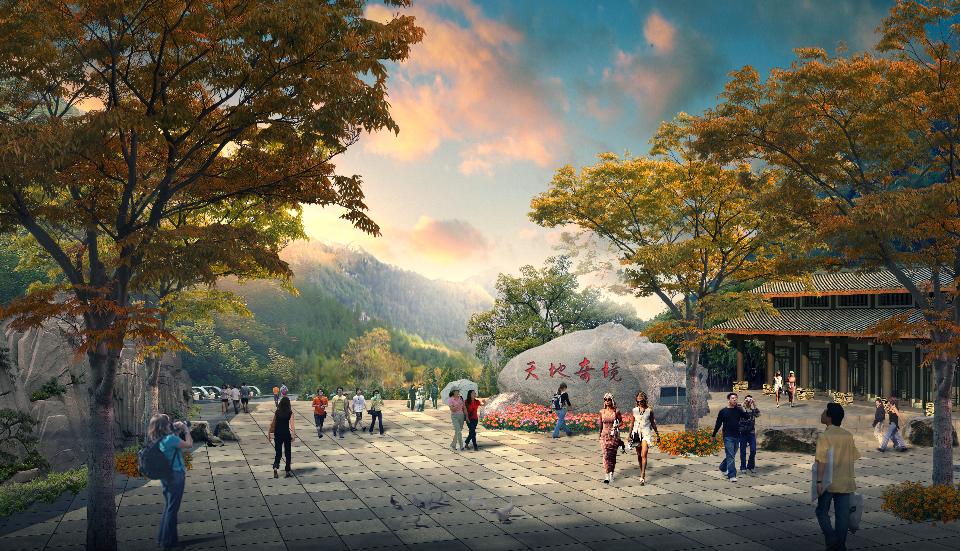 項目遵循“高起點、大視野、大旅游”原則,通過機構科學、嚴謹的咨詢方法和工具進行整合、提煉和分析,提出了“生態優先”、“國際發展”、“集群發展”、“項目拉動”、“和諧發展”五大策略,擬定“天坑地縫·天地人和”的主題定位。充分尊重現狀、利用現狀,采用軸線布局手法,形成本項目“一核一軸·三大片區”的布局結構。